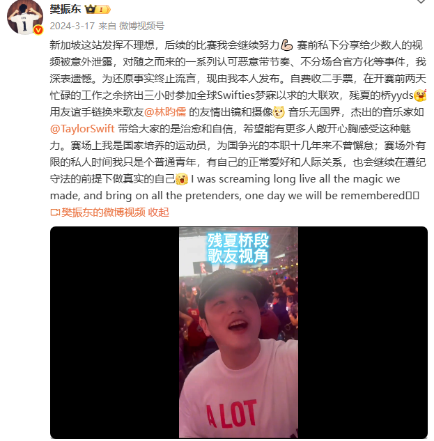 据此前报道,2024年3月,当时世界排名第一的樊振东在WTT新加坡大满贯赛败给小将林诗栋,由于赛前曝出樊振东现身泰勒·斯威夫特新加坡演唱会现场的视频,有网友批评他是因此耽误训练,才导致了比赛的失利。